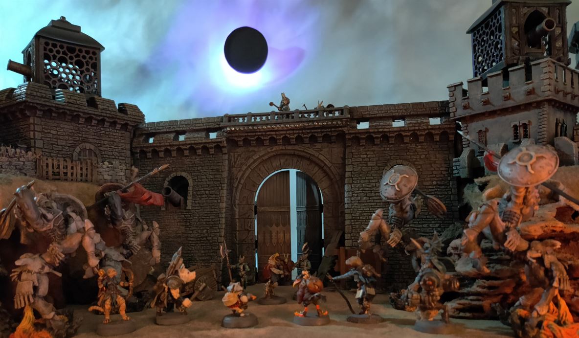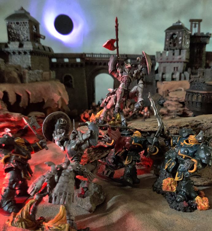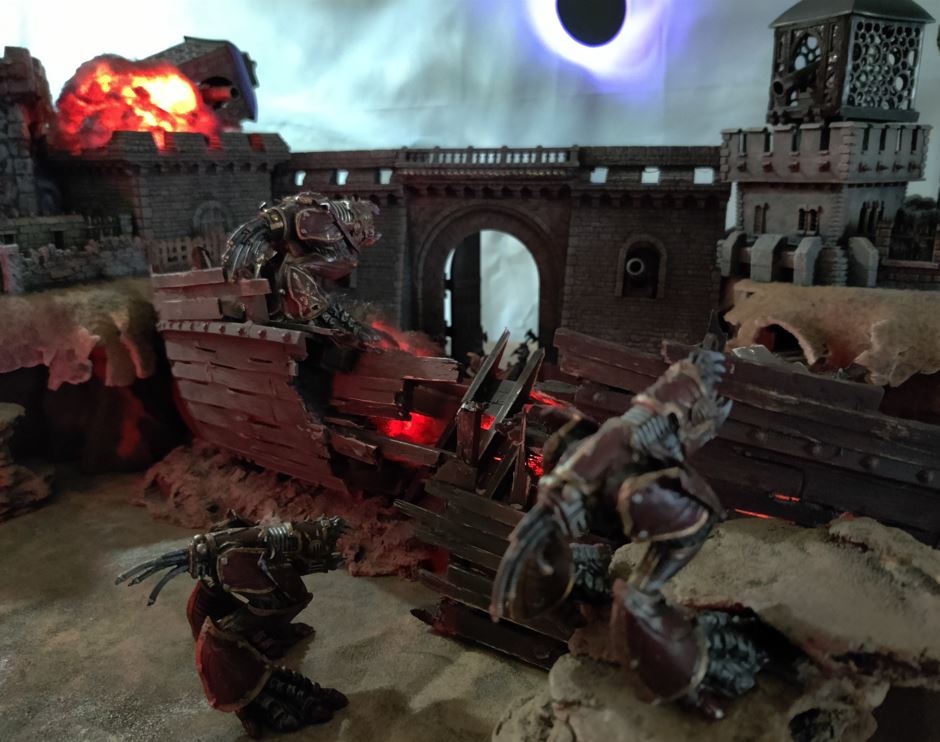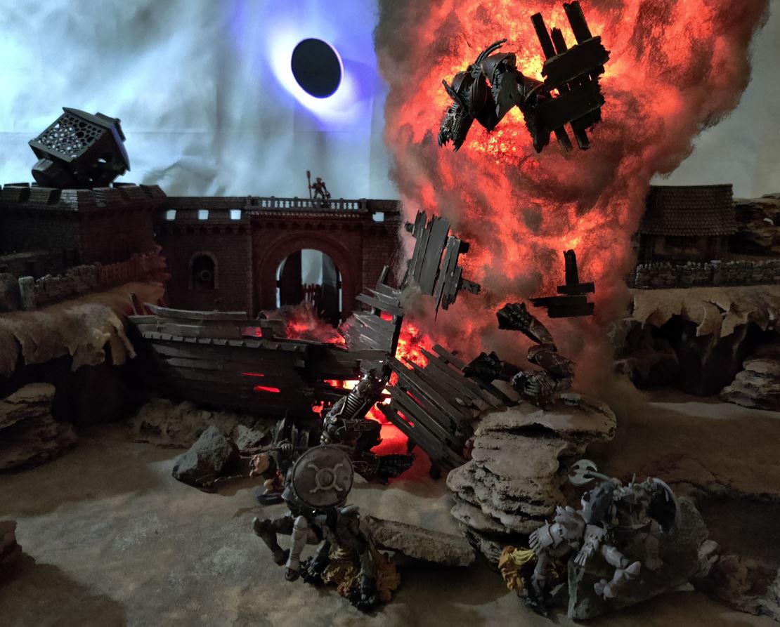 The Devourers charge the gate, scrambling over the wreck of the Stormstalker.