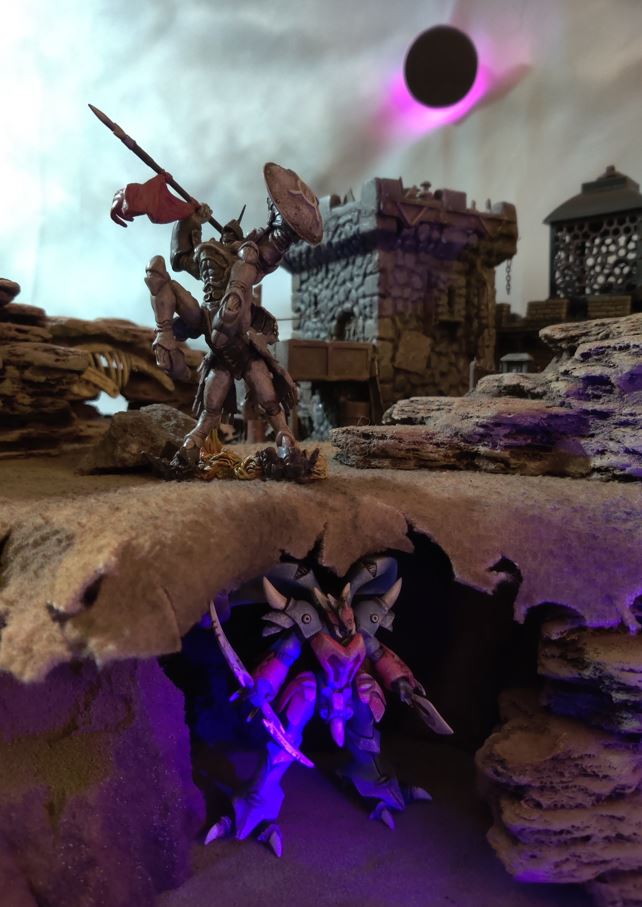 Inside the gate, an actual Devourer bursts through a hole in the wall, surprising two gate guards in the armory!