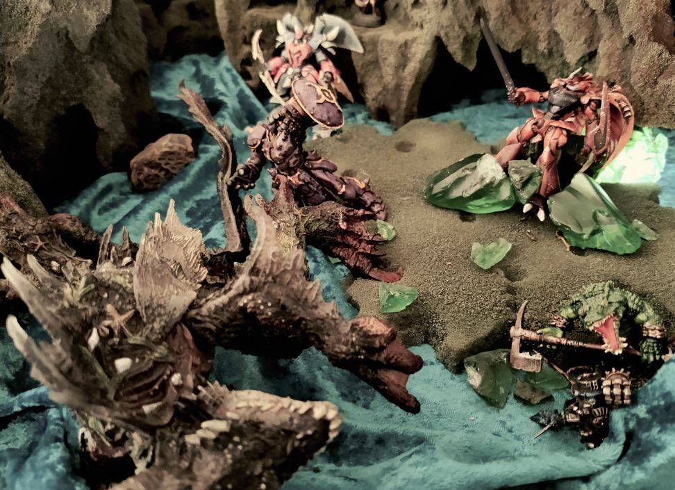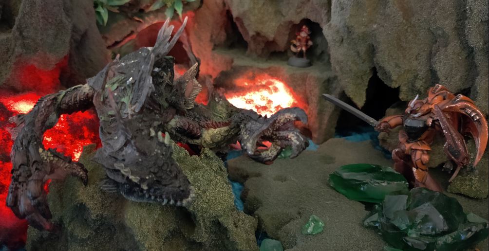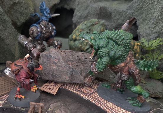 The behemoth grapples Cali's Auran, nearly crushing her. Squalor charges in and stuns the creature.