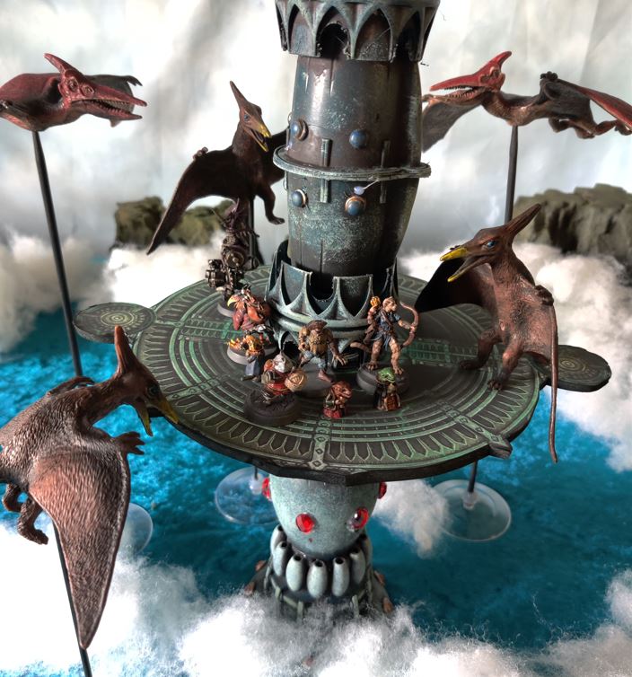 Higher and higher they ascend up the tower, until, above the clouds, they are surrounded by giant Pterodactyls!