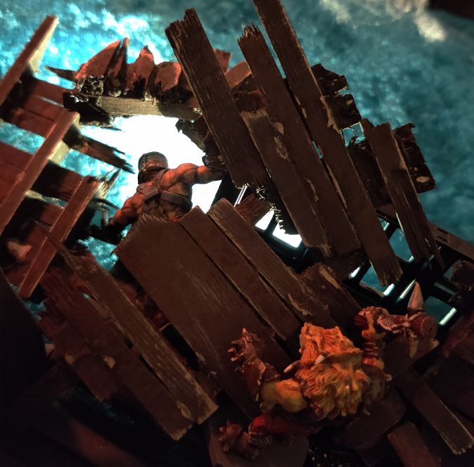 Mayne comes down much harder, exploding through the deck into the hold below!