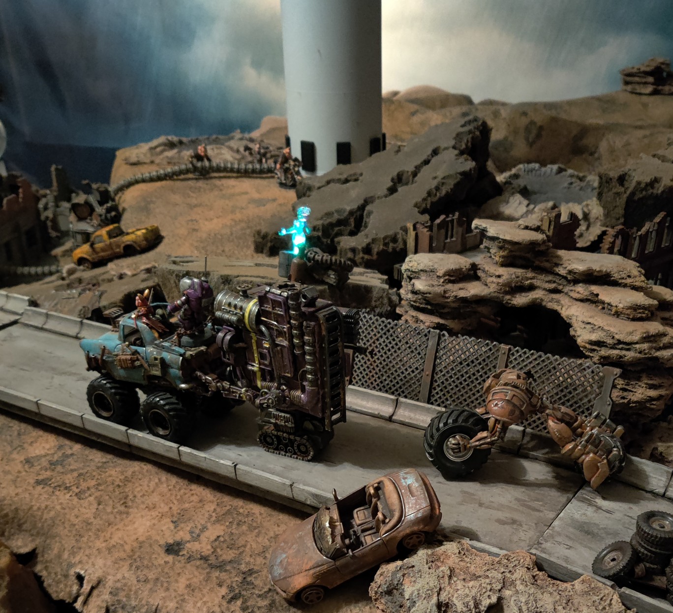 While the Road Hogs are distracted, Talos charges down the ramp, crashing into one of their vehicles!