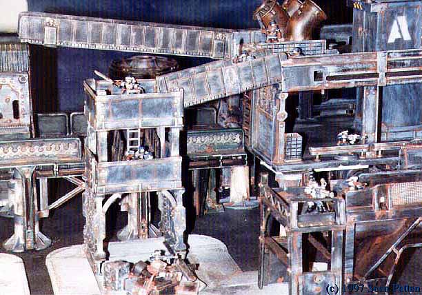 Here's a nice shot of my custom Catwalks and towers, with some of my elevated road sections ("the El") in back. Games are much more fun if all three dimensions are used, so getting up in the air is important. The catwalks are made of an HO trestle kit, and I cut the kit into several different lengths to bridge various gaps between buildings. The towers are nice for connecting intersecting catwalks, so I make sure to have a slot or two wide enough to drop the end of a catwalk neatly into a tower. Otherwise, I put solid railings on all my accesways to ensure the models get good cover. Notice the gothic arrowpoint detail along the walls of the El (brass on green)- this was done by cutting paper thin sheet styrene (available in hobby shops) with a pair of pinking shears (you know, the zig zag ones for sewing), and then punching holes in the "valleys" with a hole punch. I then glued strips of this detail onto the walls.