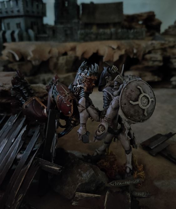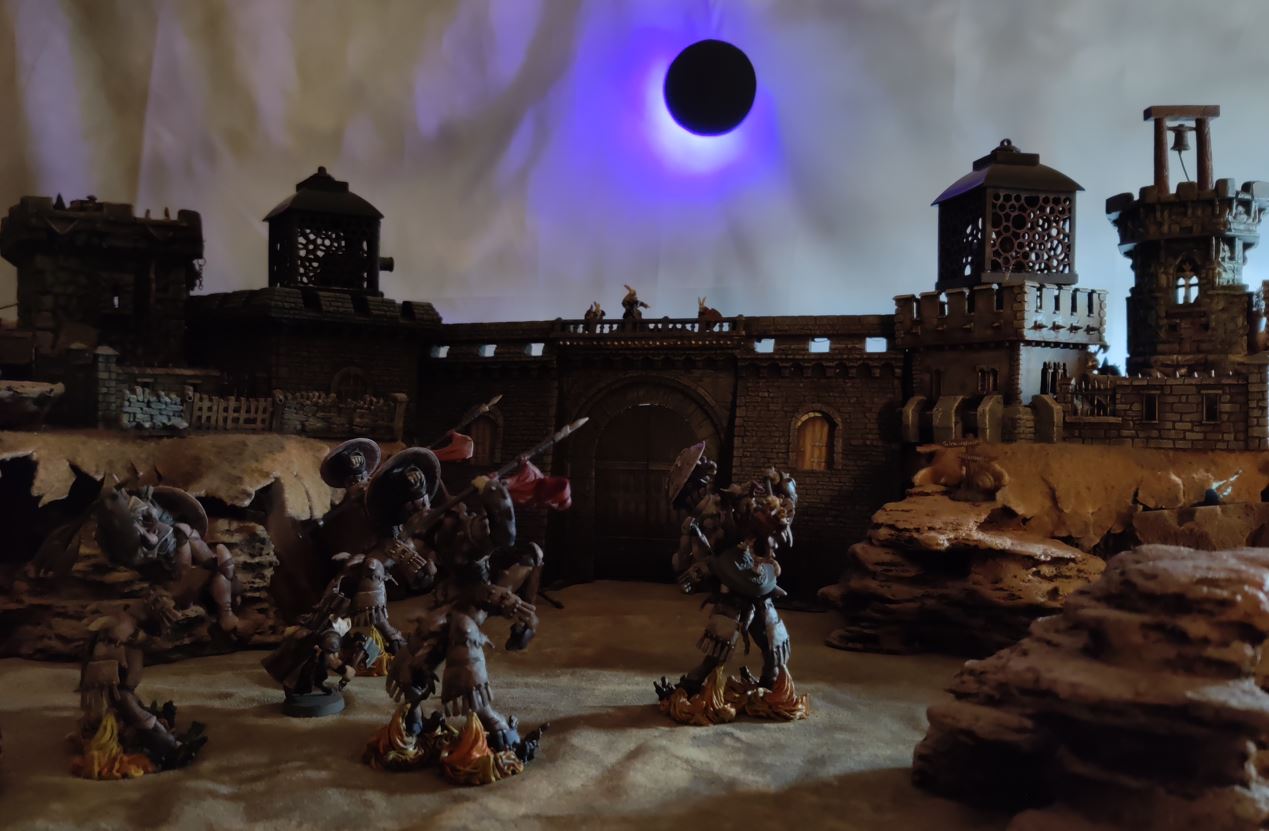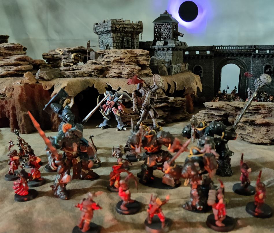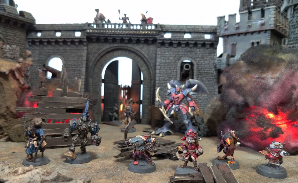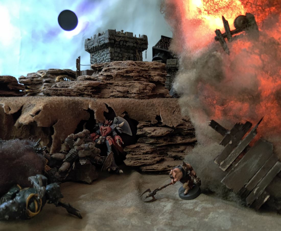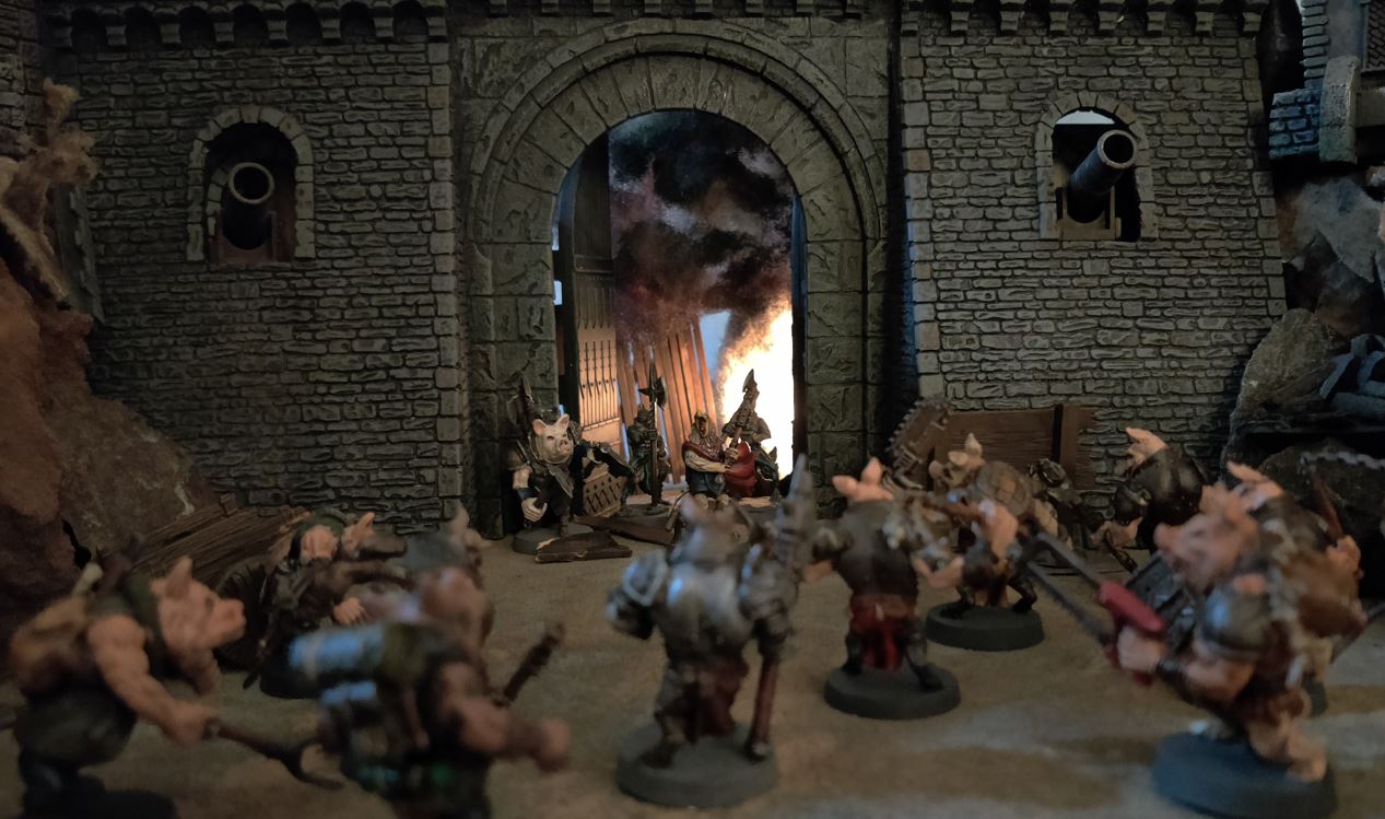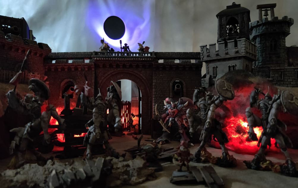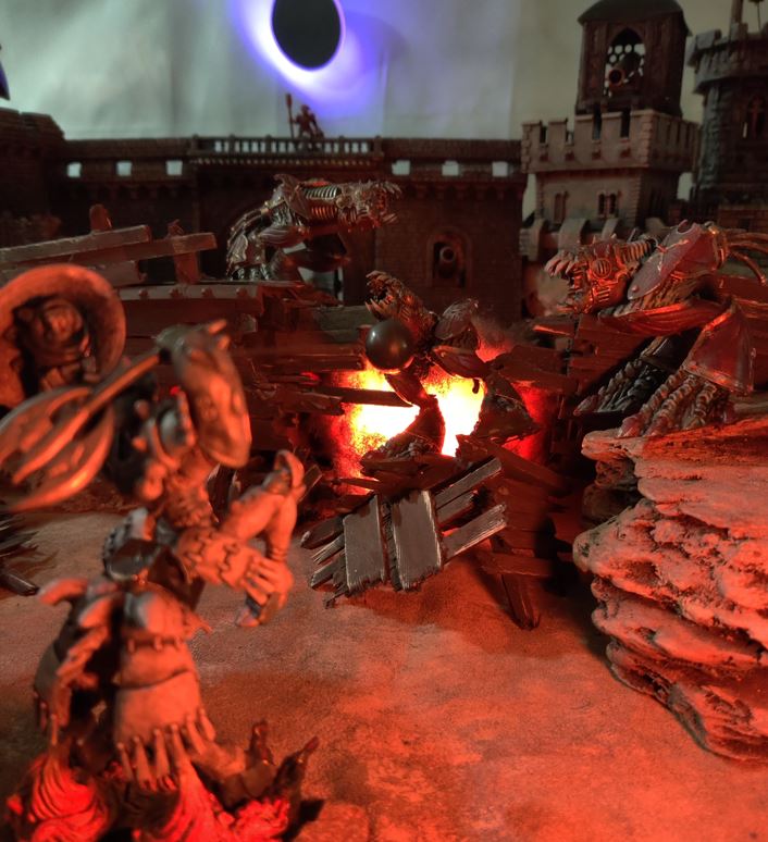 The Devourers charge the gate, scrambling over the wreck of the Stormstalker.