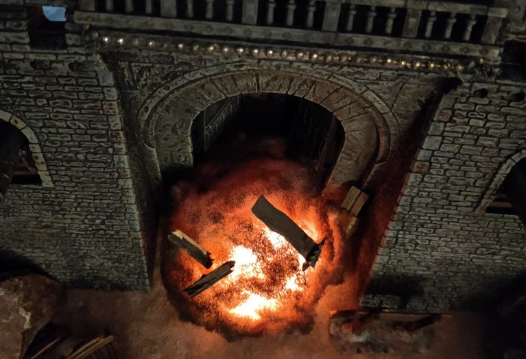 Inside the gate, an actual Devourer bursts through a hole in the wall, surprising two gate guards in the armory!