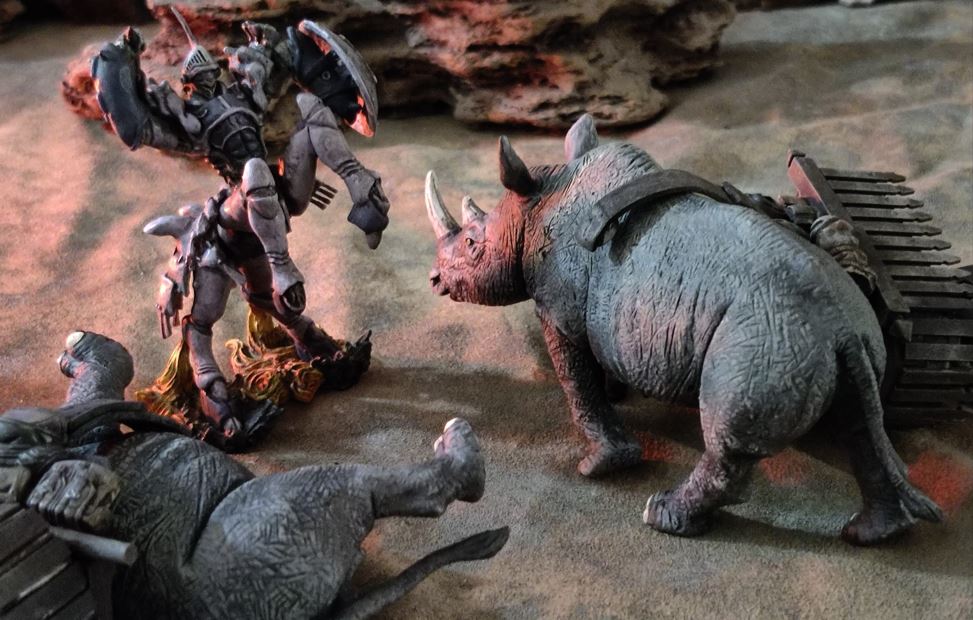 Finding one of the Beastmaster giant Rhinos running amok, Griff cuts loose its howdah and soothes the beast with treats.