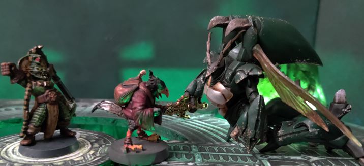 sculptures on opposite walls- giant insect-like humanoids that remind