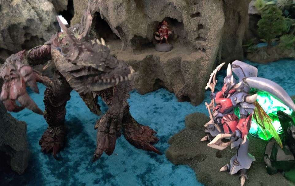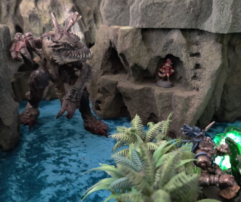 The behemoth grapples Cali's Auran, nearly crushing her. Squalor charges in and stuns the creature.