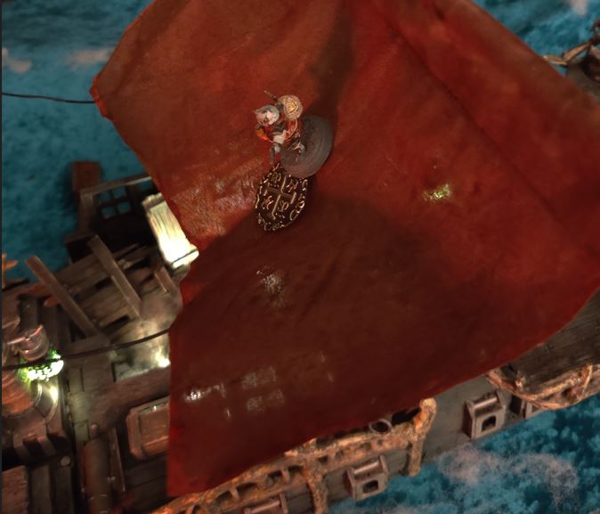 Griff's Druid magic bends the ship's mast to catch Gramblarr in time.