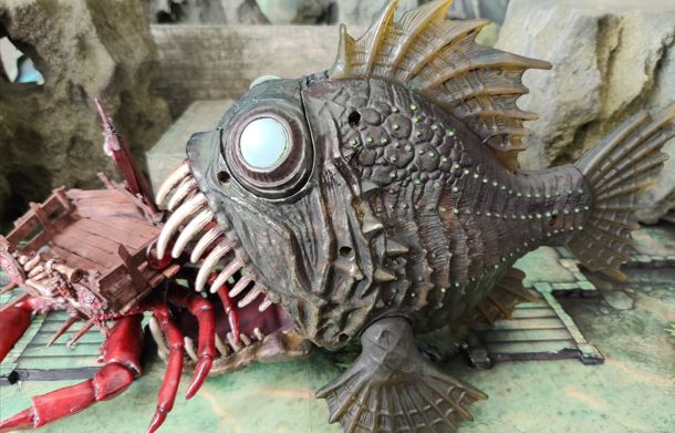 Unfortunately, the main chamber has a hole large enough for the M'Angler to get inside, and it suddenly strikes, attempting to eat Squalor and Kroff, the pirate leader, in one giant bite!  Kroff manages to wedge his axe into the M'Angler's mouth, allowing them to escape consumption.