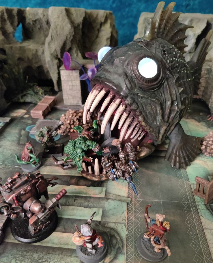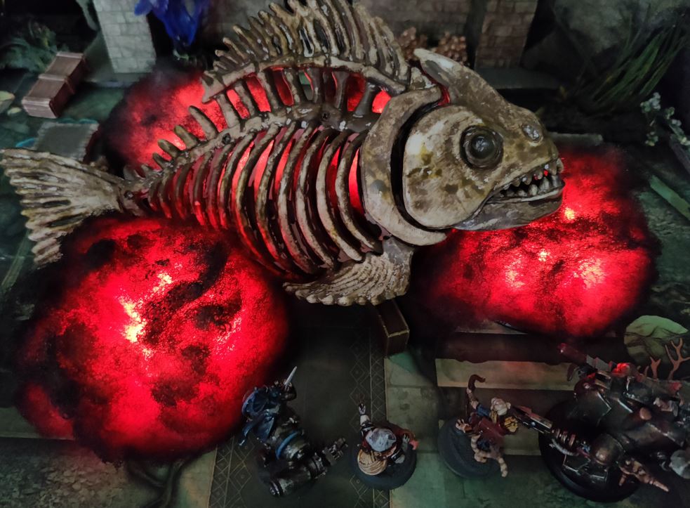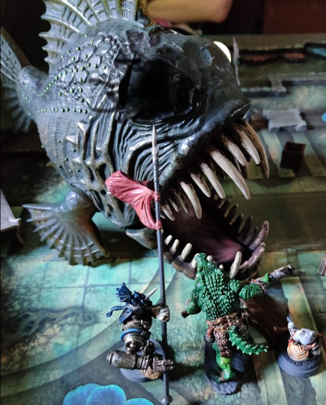 Squalor imparts his martial pride to the giant fish, poking out one of its glowing eyes with the oversized Lance.  The others whittle away at the behemoth, weakening the other eye as they attempt to evade its flash attack and poison spine barrage.