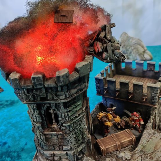 The blast squarely hits the top of the Fort, cascading debris down below...