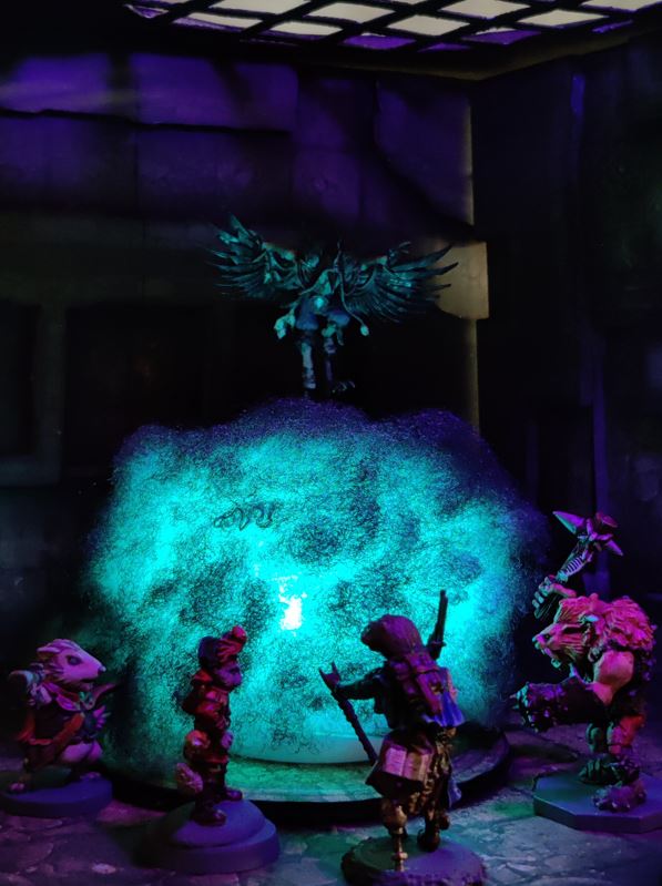 As the four descend into a special chamber, the lights dim, and winged
