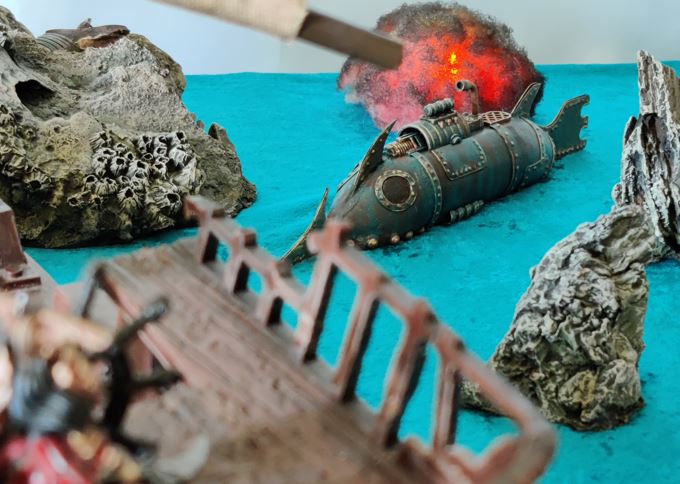 A brace of torpedos splash out of the front of the Stormstalker, scuttling the other Barrage Barge.