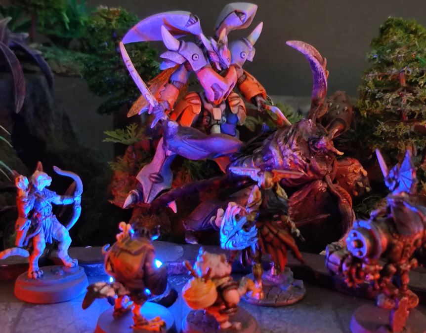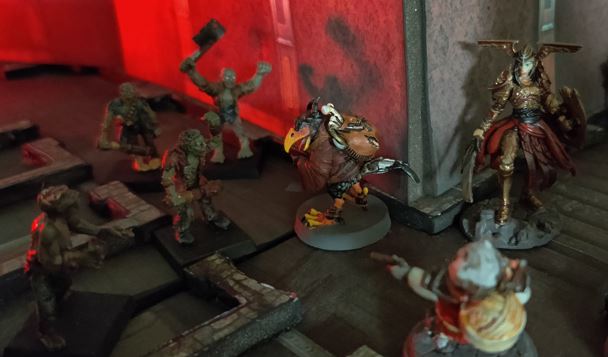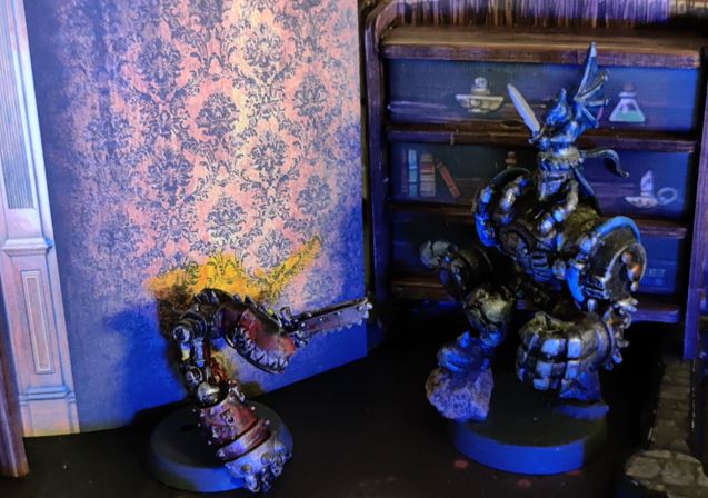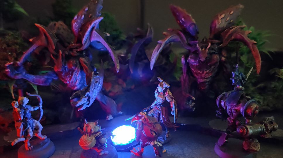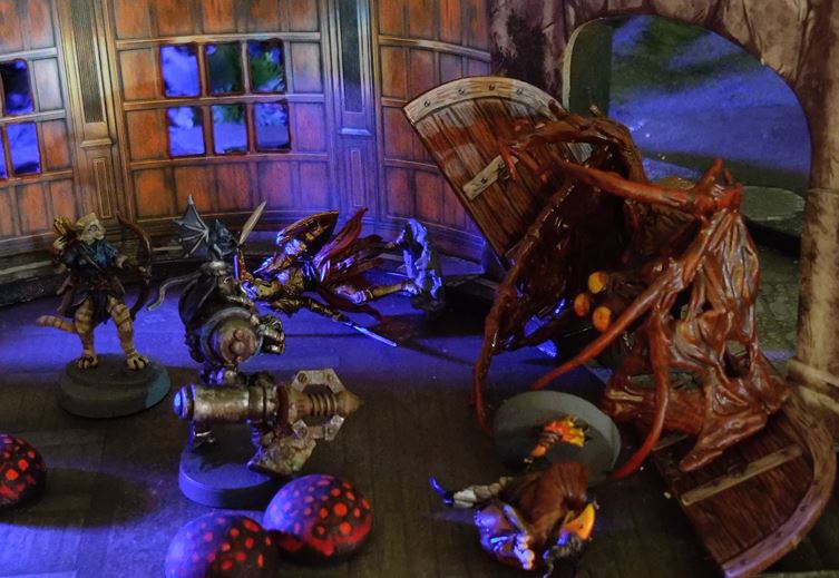 Clawed, armored Larvas skitter up onto the porch! The party does their best to knock them back down.