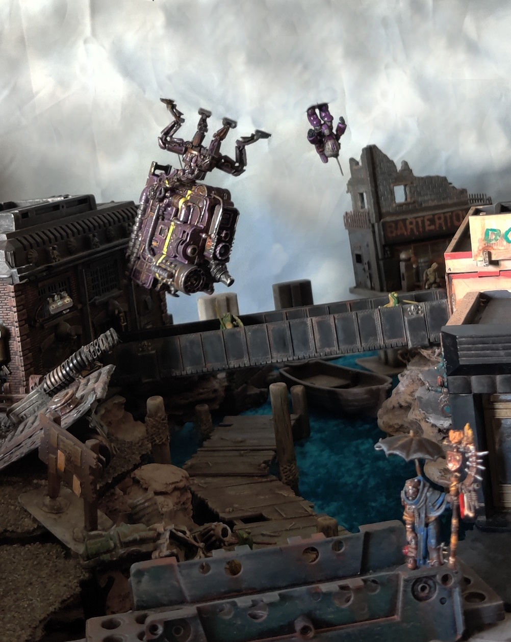 DW-40 tosses the biker below, where a town robot shoves him into the water.