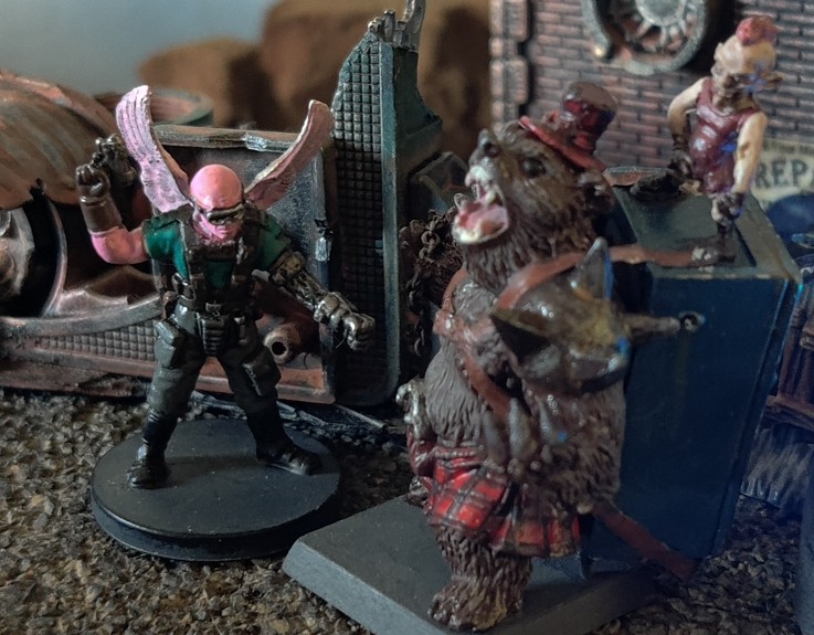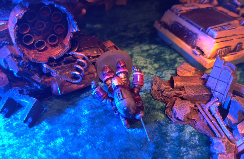 as DW-40 rolls forward and falls over like a hunk of machinery. "This is serious, no funny business!" The Road Hog shouts to the jester-like Sarah.