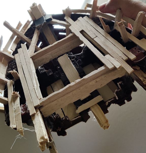 Megablocks ship hull section has a bunch of coffee stir stick "timbers"