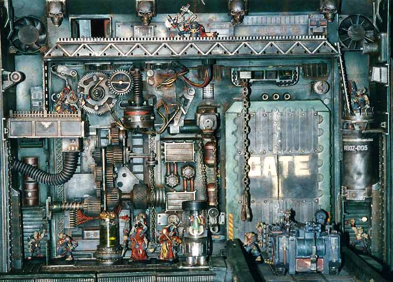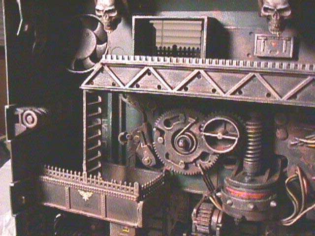 Yes, Bulkhead 2 also has an interior! This time, I spent less work on pipes, concentrating on gears instead. Two computer fans frame the top of the piece. The balcony that runs along the top connects to the one on the front through the door in the upper left corner. The Skull shaped vents were made by cramming more of those cool skull key rings into square sockets. More wire, oil drums, rubber tubing, chain, and other madness fill in all the blanks so that even the "simpler" of the two bulkheads looks frighteningly industrial. In addition to the typical gritty paint job, a few well placed decals really help make the scene. Be sure to "dull down" your decals and stickers with some matt finish varnish- I mix in some brown to make them look even dirtier.