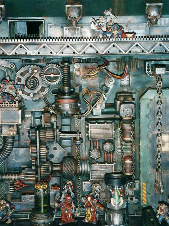 The main gear cluster is part of the stepping motor from an old dot-matrix printer (love those printers, chock full of parts!). Other gear parts are from broken Cassette tape players. The heavy chain on the right is actually chain for holding reading glasses! The claw on the end is from a plastic Mega-Gargant arm. One thing kept me going as I worked on all this madness- the Jes Goodwin illustration of two tech priests conversing in front of a big tank holding a Tyranid head. I love that picture- as you can (hopefully) see by the Hive Tyrant head in the tank at the center bottom.