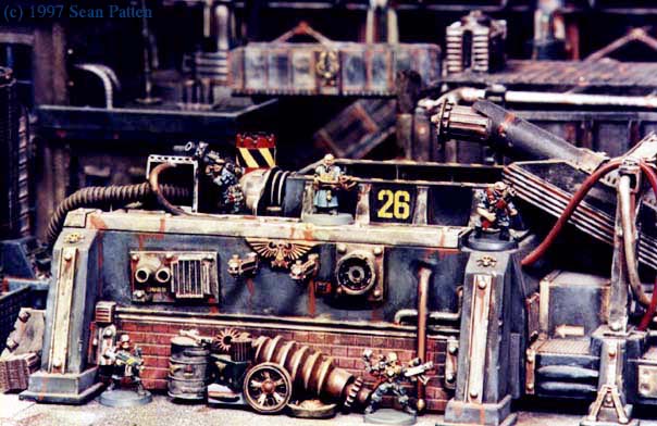This building started out as a Hot Wheels Car Crusher toy! I completely stripped it down and re-detailed it, including adding the brick paneling along the base to cover up holes in the original toy. Although the Forge is an earlier model and has a more primitive paint job, the details are still strong. The Junk pile was built up with various toy and model parts, including bits from the original crusher toy. The eagle is actually a pewter badge that I picked up from a UK Games Workshop store, but I don't think they have them anymore. Plastruct girders were added to the pylons (along with rivets) for that reinforced look. Plenty of pipes on this one- mostly copper and plastic tubing. I used some stickers and decals from toys to add character to the base paint job. Usually it's a good idea to paint over stickers with a matte finish so they aren't so glossy looking.