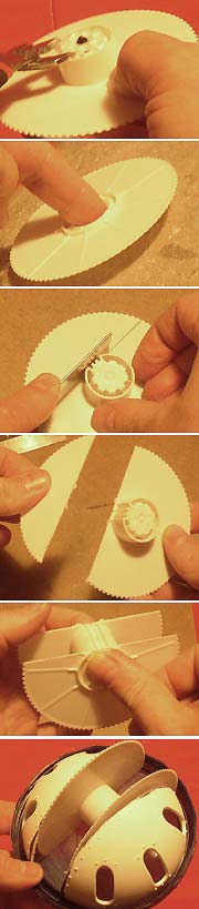 With the cannon assembly finished, it is now time to assemble the turret. Test fit all the parts together on the inside of the Ziploc lid as shown. Then, glue the cannon and mantle to the lid. Now add glue to the edges of the wiffle ball quarters and press them
