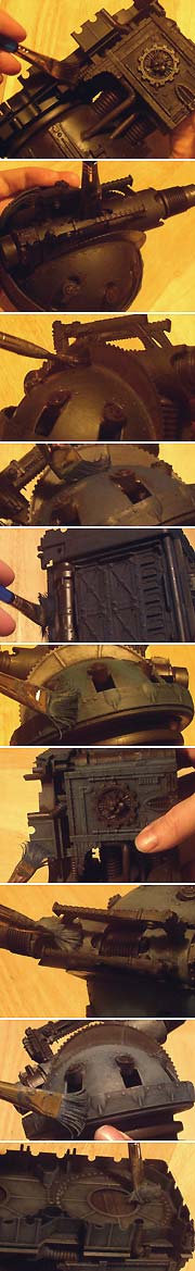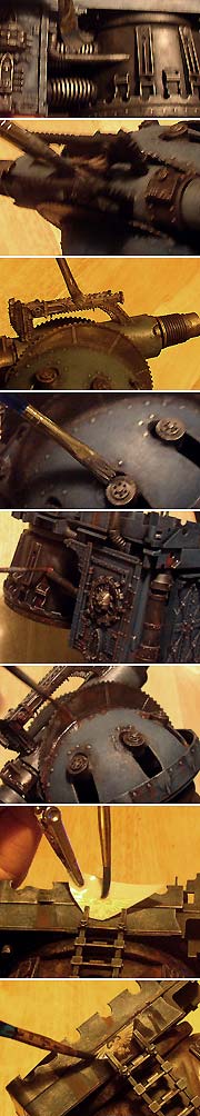 Mix brass and steel for a bronze metallic color and drybrush this over all the dark brown areas. Gently drybrush steel over everything, taking care to highlight the