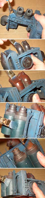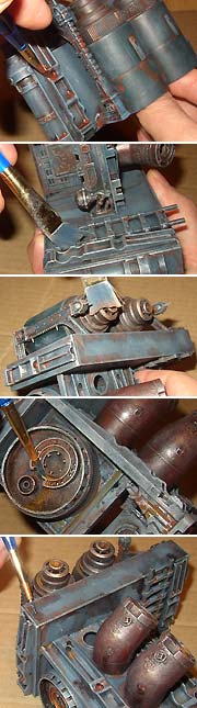 Now for the washes. Start with a rust brown wash along all crevices. Remember you can streak the washes downward for a realistic rusting effect. Once the rust wash is dry, switch to drybrushing metallics.  I