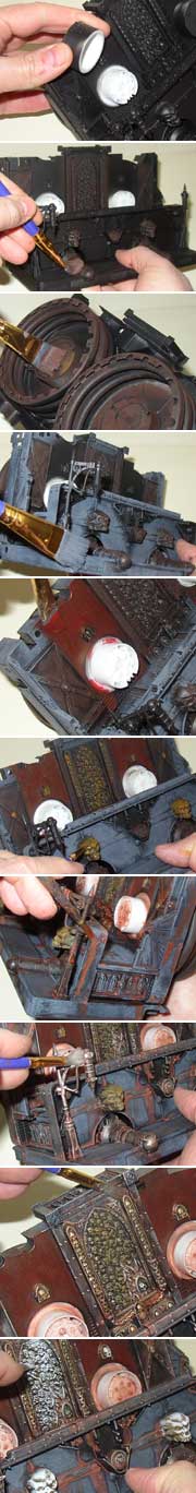 Using a dark brown, drybrush all the skulls and mechanical areas (anything