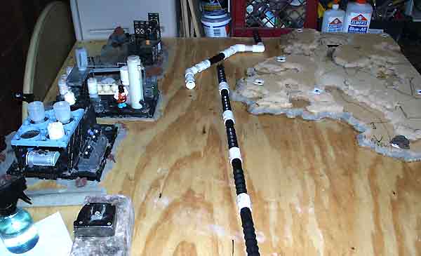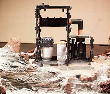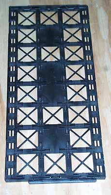 But the biggest aid in the construction of all three of the structures was carbon fiber frames I got from a friend of mine (thanks Mat!). These frames (pictured left) are used to hold computer chips during the manufacturing process, and are extremely hard! They are also somewhat brittle, so I couldn't just clip them with cutters or they'd shatter- I settled for sawing through them with a razor saw (very slowly and painfully) to get a clean cut. The structural detail, large volume (I cut up 3 of these guys), and nice square shapes made them perfect for "framing" the refinery structures. They superglue well and paint up fine, once you get past the sawing, shattering, and cursing. |