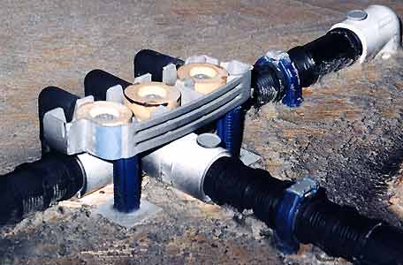 The two blue pipes curving up to the ceiling (and two more purple ones