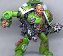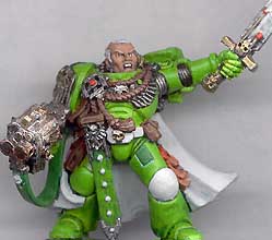 A simple hand swap on the command squad sergeant allowed Chris to include this severed Medusa head (from a Lamian vampire). This odd chapter relic has been put to good use! Note the dark skin tone on the Sergeant's head, nicely shaded by Chris. |