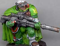 Chris Ferriera, a new addition to our team of players, painted up all his own models, inspiring me to write up special rules for the Sons of Medusa. Here's his scout sniper. |