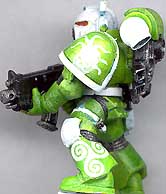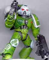 | A typical marine. The green is well shaded with blue wash, and the white forms a good trim color. Note the swirl patterns on the armor- these are simply decals from the Wood Elf line, conveniently colored green and white. They add a great "tribal" feel to the marines. I encourage anything that can give your space marines personality, and this is a great example! | ![]() |
