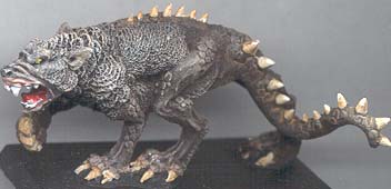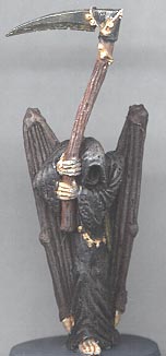 The Undead warband in Mordheim can be expanded quite easily by adding any number of troop types not in the original listings. We have added powerful Wights to our game, much to the frustration of the living. This model is the Daemon Prince Mortarion from the old Epic 40K game. The wings are painted dark brown and drybrushed tan, the cloak painted black and drybrushed grey to catch all the fine detail of folds. The bone areas are painted white and washed with light brown. The scythe is painted black, drybrushed with steel, and washed with light brown for weathering. |