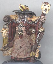 No undead army is complete without a necromancer. Although this is the Henrichh Kimmler model, it has been toned down by chopping down the hat to make a more western style floppy hat, and the top of the unwieldy staff has been replaced with a simple horned skull. To emphasize the undeadness, I added an arrow through his hat (and shoulder) and a knife still stuck in his unfeeling back! |