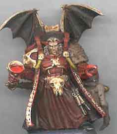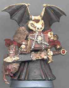 The chained up book on his back is from the Chaplain Bike. The bat wings are from a Warhammer Quest bat, added to the cloak in place of the original collar (which was cut and filed off). The horned skull is from a Librarian model. The sword is from the Chaos Warriors boxed set, and the dangling snack is from the plastic Zombie boxed set. I used dark red for most of the model. The cloak is black with red highlights, as are the bat wings. | ![]() |