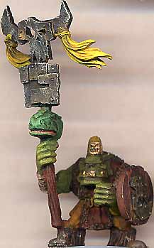 Because we have rules for Standards in Mordheim, I whipped up this conversion. The standard is made from a 40K ork boss back banner, atop a feral orc standard pole (including severed Lizardman head). The shield is from the plastic orc regiment. The body, however, is actually one of the old Snakebite ork metal bodies, perfect for savage orcs. | ![]() |