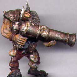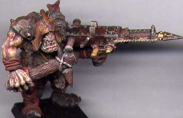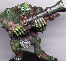 Ogre metal body and arms. Head from plastic fantasy Orc. Speargun from Gorka Morka (vehicle accessory). He also has a scorpion tail taken from an old chaos steed (can't see it in this shot). | Ogre body. Plastic Ork arms (bent the left hand open). Cannon from Fantasy Battle. Head from plastic Marauders. | |