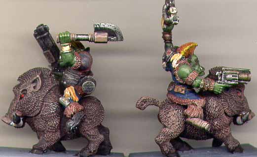 The rider is made mostly from the new fantasy orc plastic. I had to move the cleaver blade from a right hand to his left, but the spear arm is stock. The head is from a 40K plastic ork, the upper body from a fantasy orc, and the legs from the original metal boar rider model. |