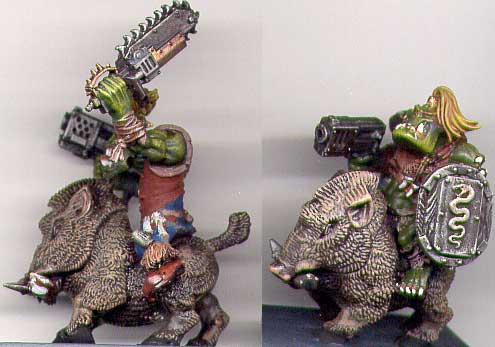This is the one Cyboar model that I really like. Unfortunately, it is very hard to get- I think I got mine from UK mail order. This is a stock model, except for the left arm which is straight off the 40K Ork plastic sprue. The boar is painted dark brown with a tan drybrush. The metal parts were painted steel, then drybrushed with copper (for the tanks) or Brass (for the mufflers), and given a dark brown wash for shading and grunge. I made a dismounted version of this rider too. I use Cyboars (vs. regular boars) to help distinguish my Nob riders from regular Ork riders. |