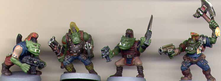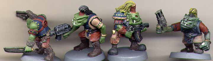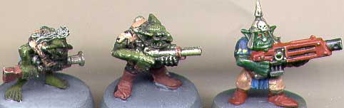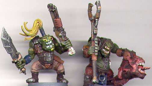This is one of the original metal ork Runtherd models (now known as slaverz). There aren't any runtherder models with both a megaphone and a grabba stick, so I made my own! I started with a metal model equipped with a megaphone, and scratch built a grabba stick out of epic ork titan bits, parts from a power axe, plastic axe handles, and anything else I could find. This model is typical of my Snakebite ork paint scheme- lots of browns and tans, blue, and yellow details (dots, stripes, checks, etc). | ![]() |