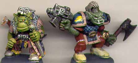 I actually made this dismounted version of the above Nob first- I liked him so much, I decided to make the mounted version to match! The only real difference is the legs- the dismounted model uses regular fantasy orc plastic legs, where the rider above uses the original metal boar rider legs. The skull trophies hanging from this model's waist are taken from the fantasy orc metal banner pole. I had to reproduce the trophies out of bits for the riding model above! | ![]() |