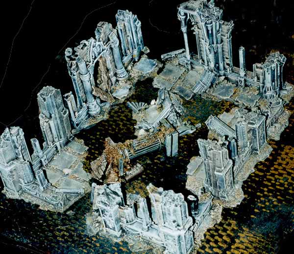 This is the culmination of all the Armorcast Terraform cathedral ruins sets I have bought. I glued them to press board, since I think ruins look much better when based up. The flagstones are made by cutting up 1 inch squares of plasticard (sheet styrene), carving some cracks and chips into them with a hobby knife, and gluing them down to the pressboard base. I used PVA (white) glue to tack down some sand in between the stones. Most of the broken chunks and columns on the ground are just busted off the resin castings. The toppled pillar in the center was made (by my friend Robert) out of a wedding cake column and a figure from a nativity scene (Merry Xmas!).