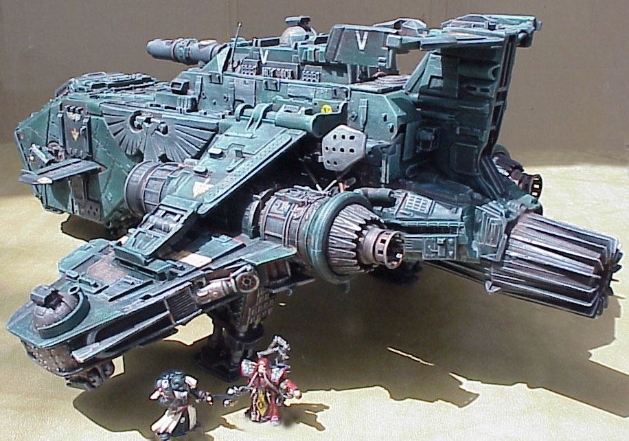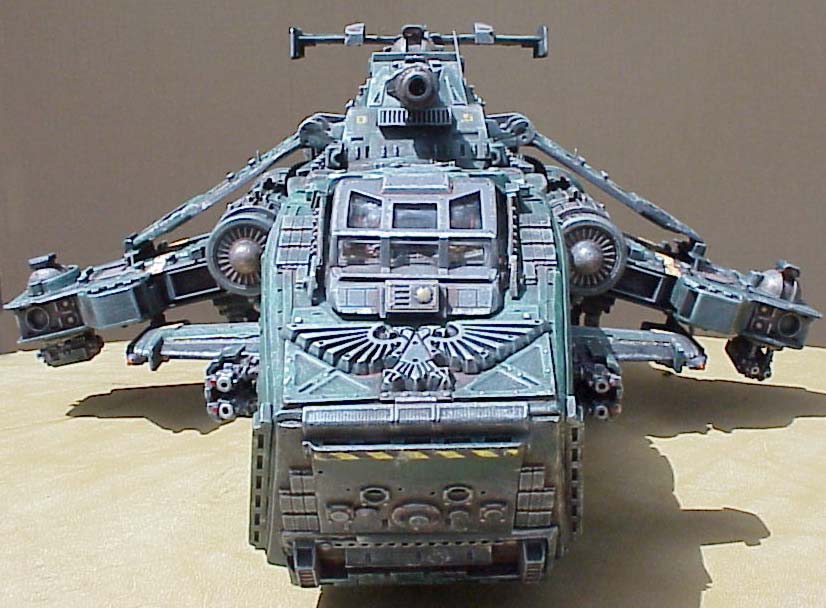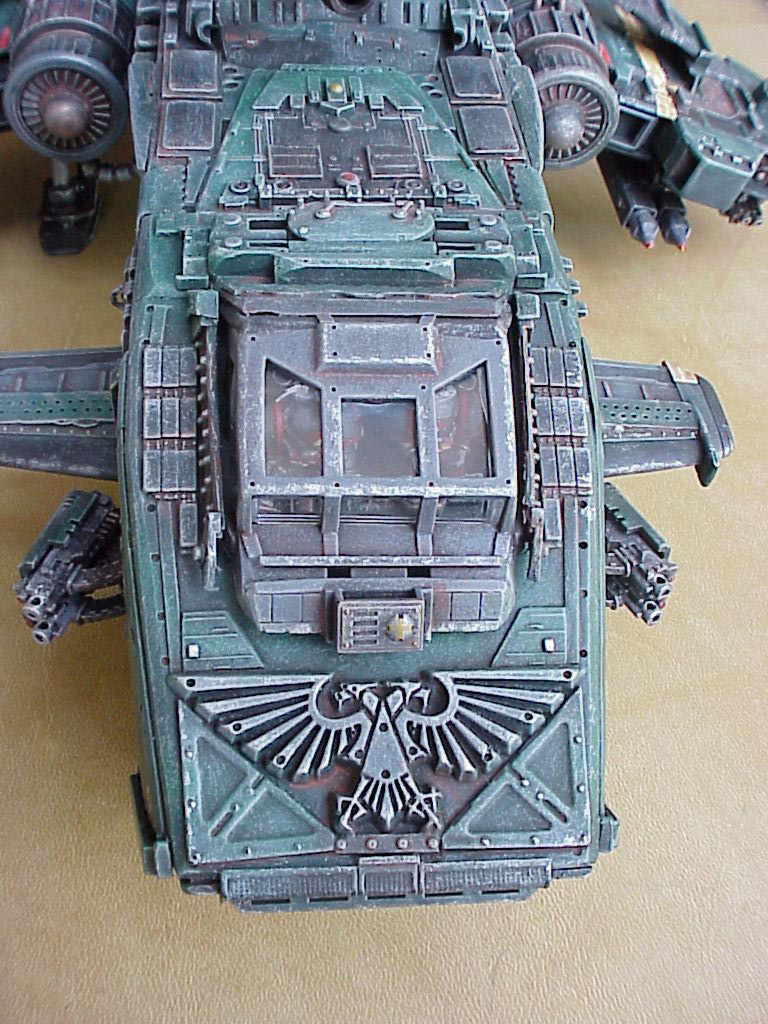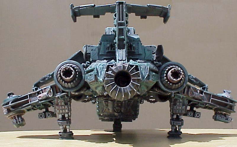 I actually based mine more off the most recent Epic scale model (which itself is based on their metal 40K scale model, which is a more detailed interpretation of the original Epic model. Confused yet?). I really liked the chunkiness and the angles of the Epic scale wings. Oddly enough, the cool downward angle of the wings has been totally lost in GW's latest interpretation- the Forge World resin cast Thunderhawk. Yes, that's right, Forge World has finally created a decent size Thunderhawk of their own, in resin this time (click here for seperate picture). It's quite nice actually, especially the beautiful interior detail. My only complaints are the blocked out center window on the cockpit (visibility what?), the undersized engines (how else can you get a brick to fly), and the planar wings. You can see how the larger resin model compares to the old metal one by clicking here. Looks like theirs is about as big as mine!