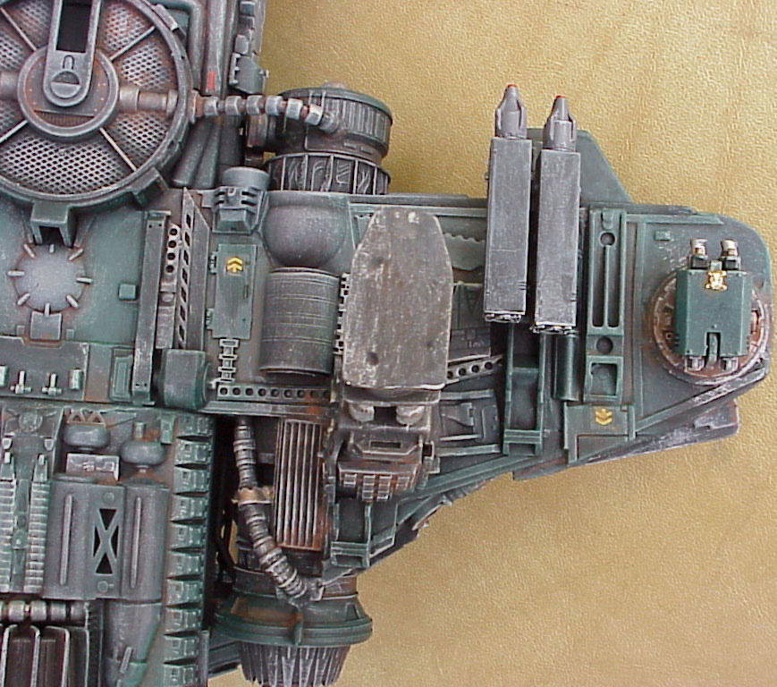 1. MOVING PARTS. Since most of the parts are from toys and model kits, the upper wings move up and down, the cockpit hatch opens, the crew go in and out, the front ramp lowers, all 4 twin heavy bolters rotate and elevate, the battle cannon elevates, the brake flaps move, the missiles can be removed from the launcher boxes, and of course, the red LED light on top actually blinks thanks to a battery pack concealed in the upper body. Whew!