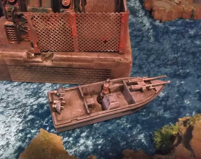 Two gunboats patrol the waters around the base. One picks up