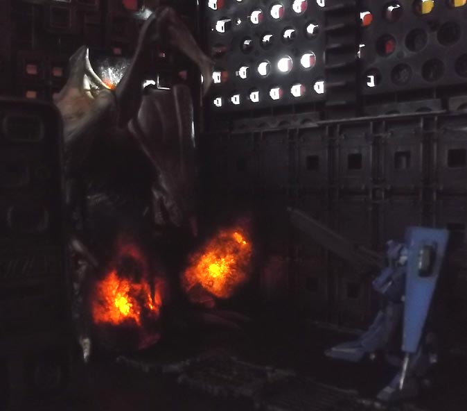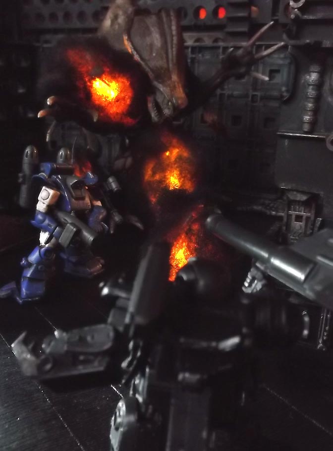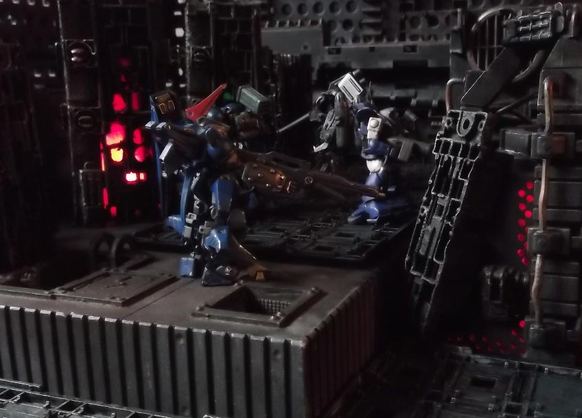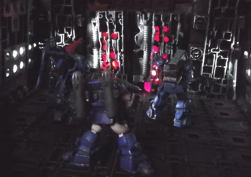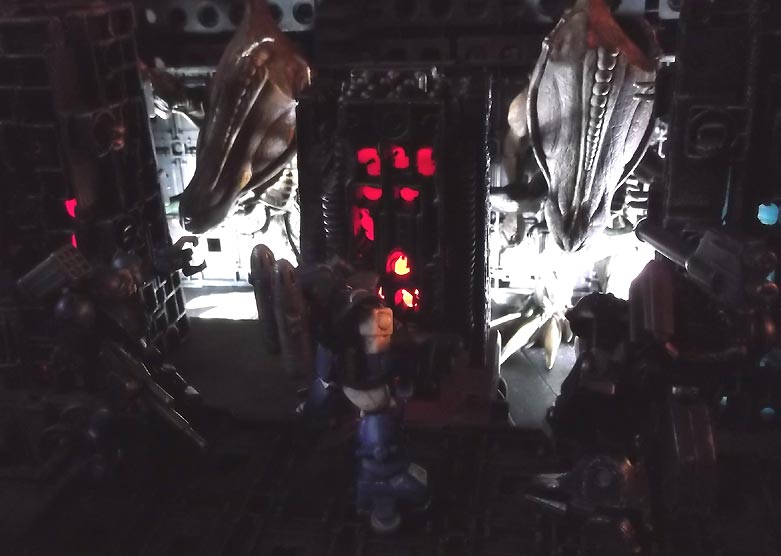 dark technology, ominous pulsing red glows emanating from the walls.